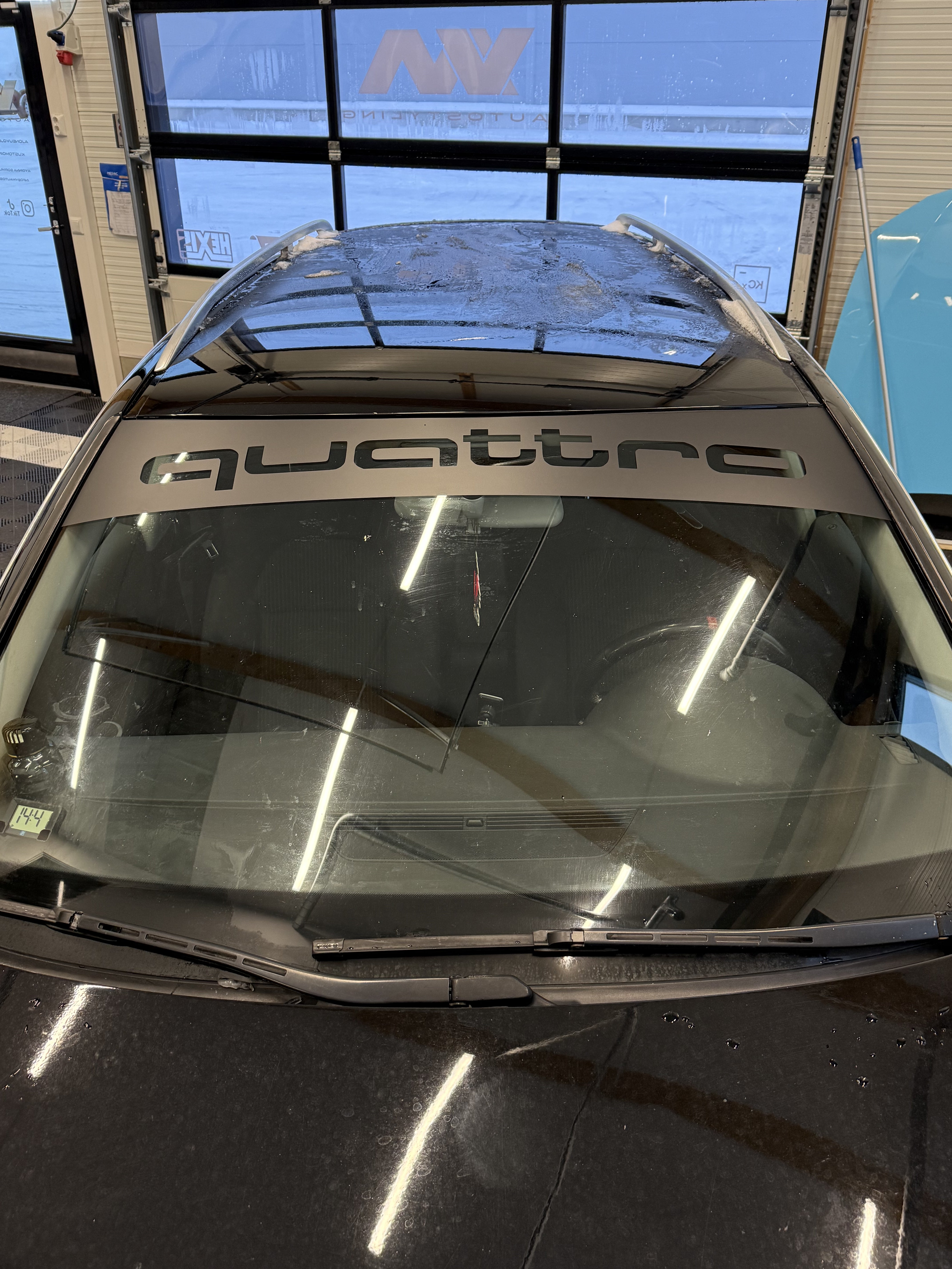 Satin black windshield sticker with cut-out "Quattro" text