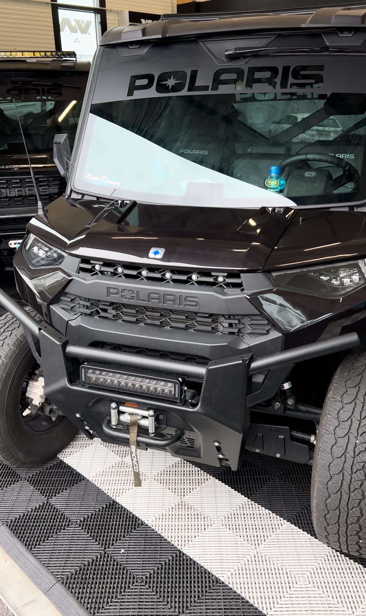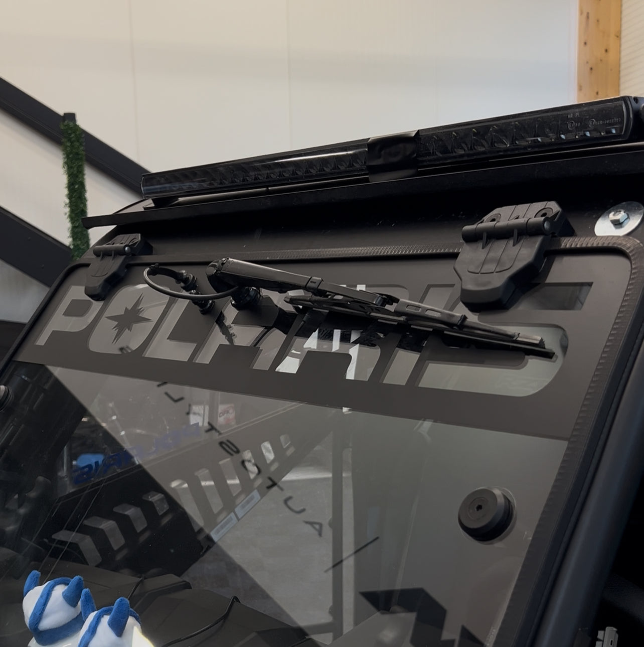 Satiinimusta tuulilasitarra läpileikatulla Polaris tekstillä